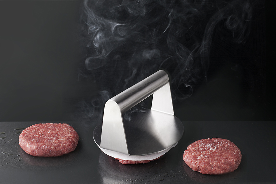 Press for flattening minced meat into burger-shaped patties. Flattens out the meat to produce uniform, compact burger patties for even cooking. Place the ball of meat on the worktop or directly onto the griddle, then gently flatten it out by pressing the appliance down to your desired burger thickness.