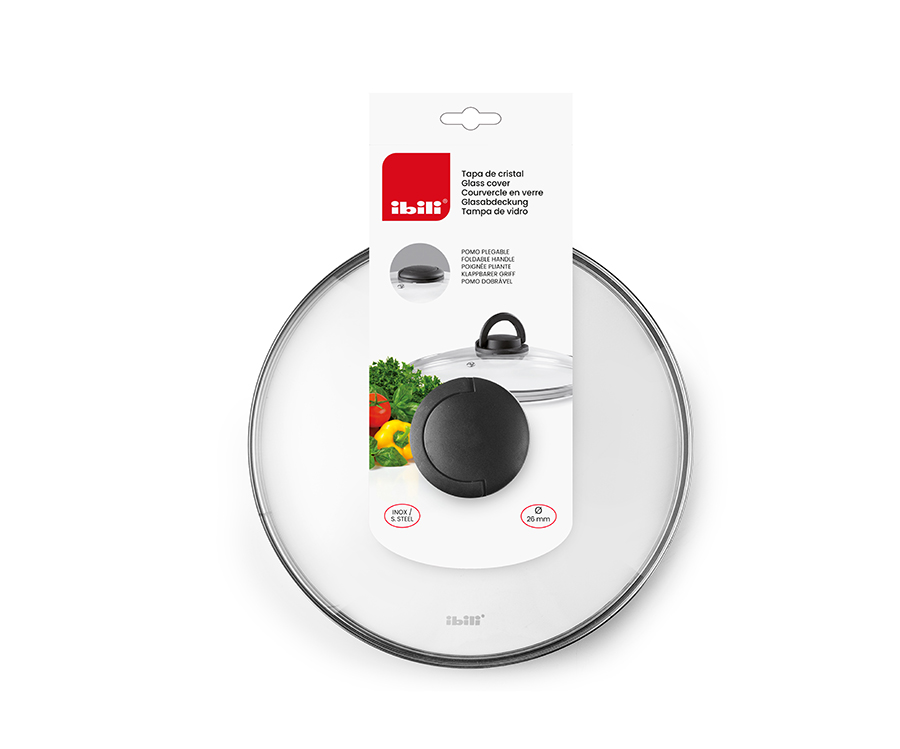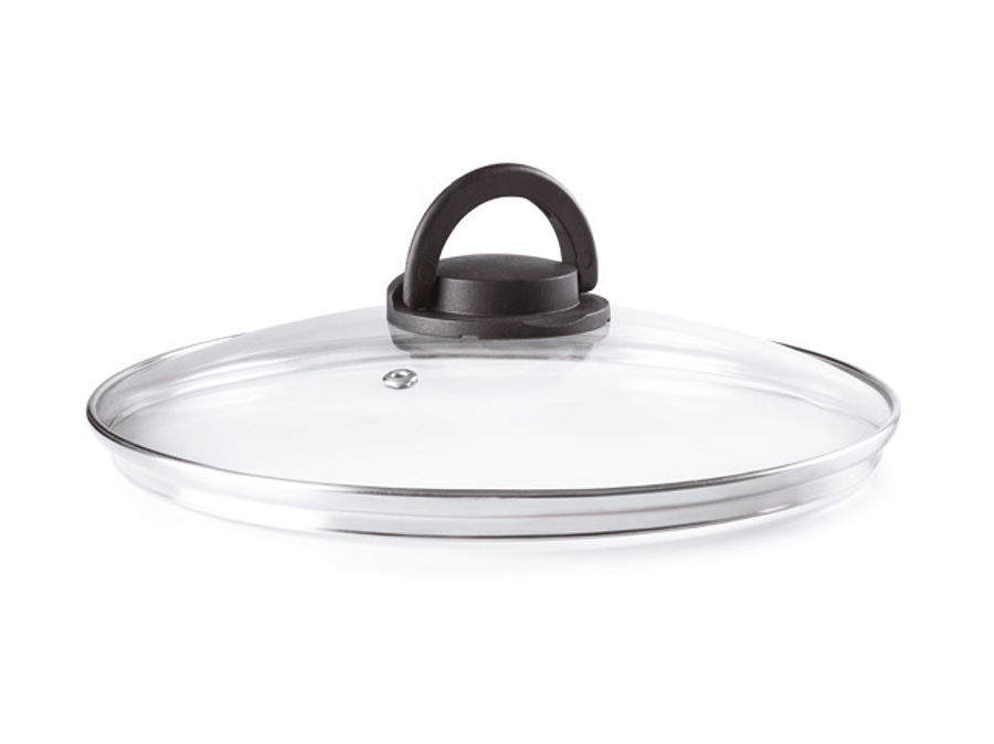 Tapa de cristal c/ pomo plegable. Vidrio resistente a altas temperaturas. Sistema anti-vaho. Inox.