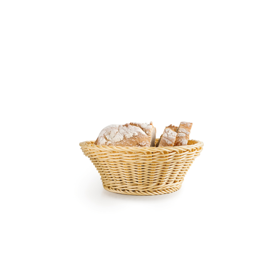Lightweight and durable round bread basket in Espiga Oro finish.