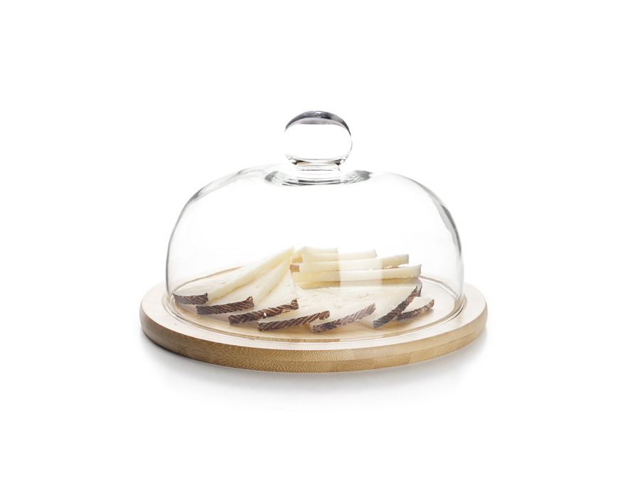 wooden base with an elegant and completely transparent glass cover. It's perfect for protecting and preserving baked goods, cheese, fruit or other food in a natural way while also keeping it visible.