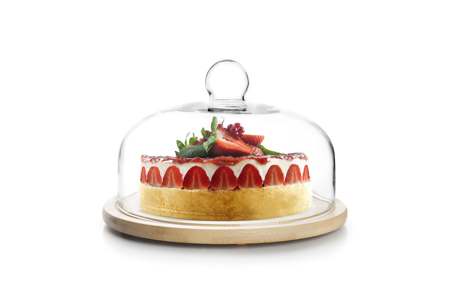 wooden base with an elegant and completely transparent glass cover. It's perfect for protecting and preserving baked goods, cheese, fruit or other food in a natural way while also keeping it visible.