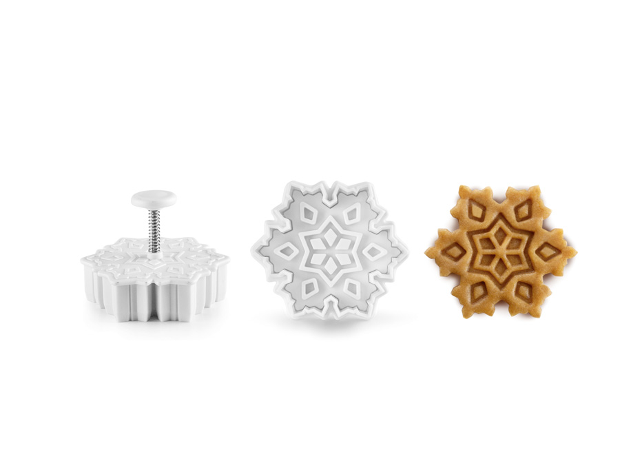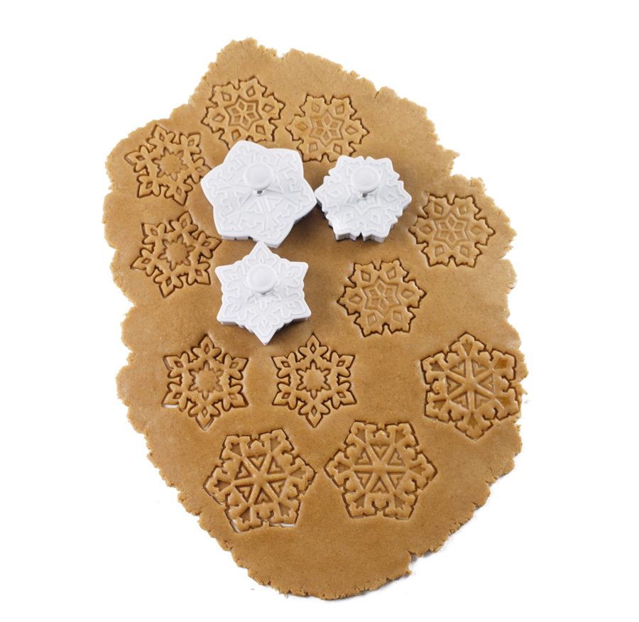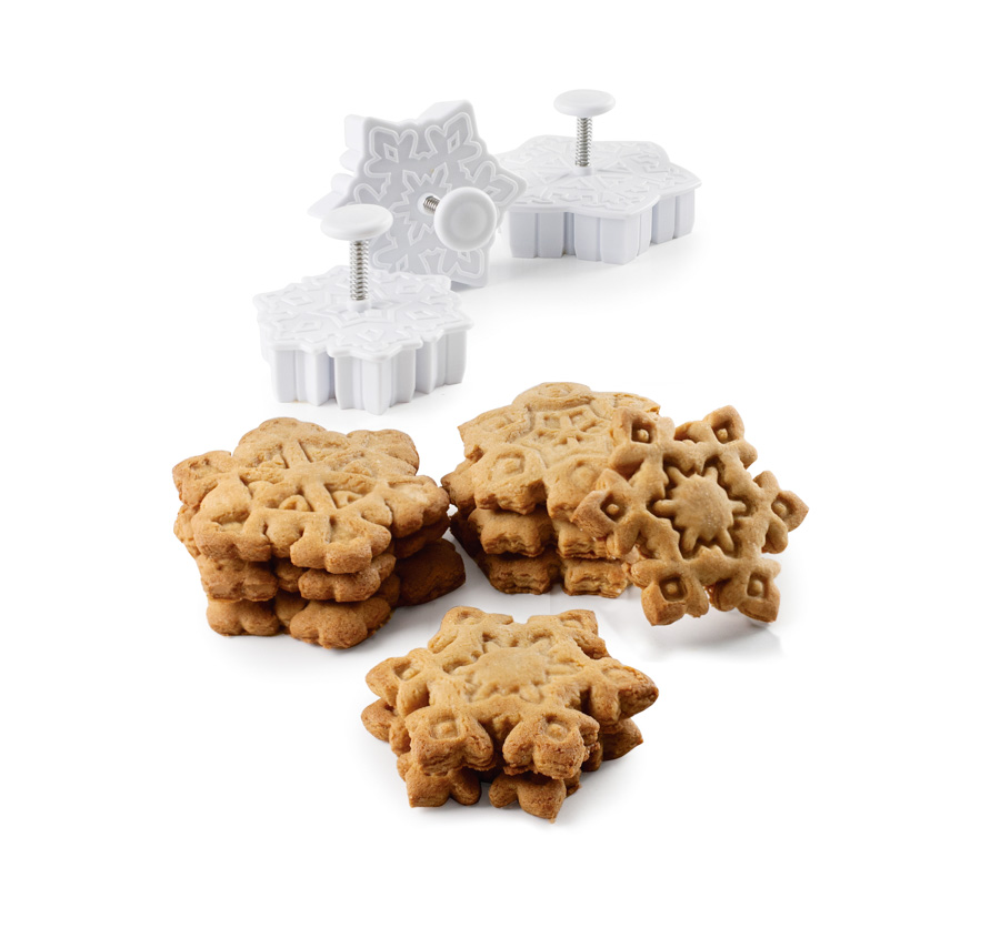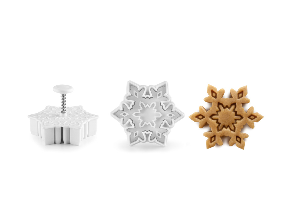 Set 3 cortadores marcadores con forma de copo de nieve. Podrás marcas o cortar la masa de galletas con 3 dibujos diferentes. Los cortadores cuentan con un expulsor para facilitar el cortado y desmoldado de las figuras. Perfectos para galletas, fondant...