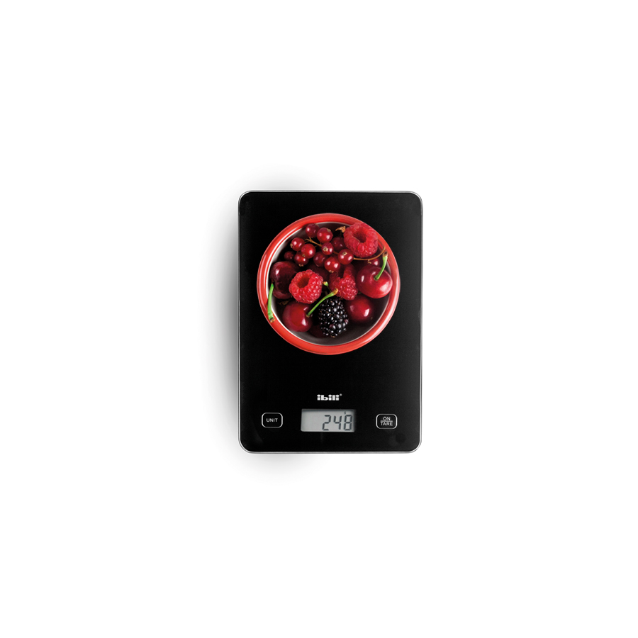 Digital kitchen scale with tempered glass platform, resistant and easy to clean.