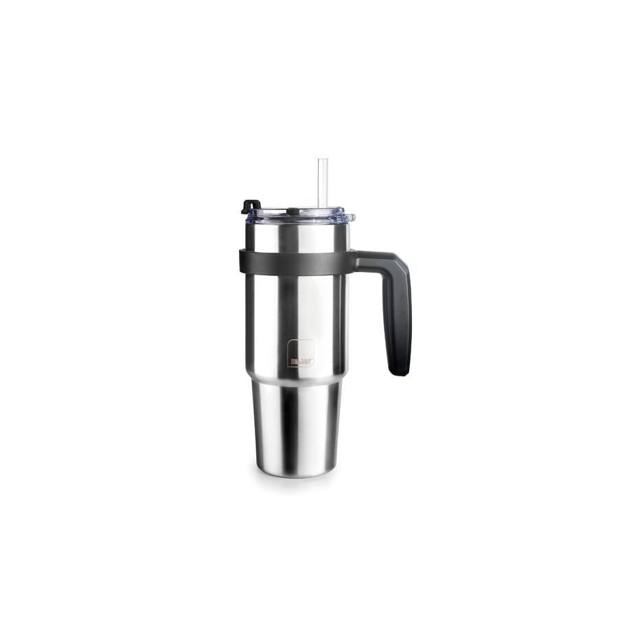 Double-wall insulated mug with ergonomic handle and reusable straw.