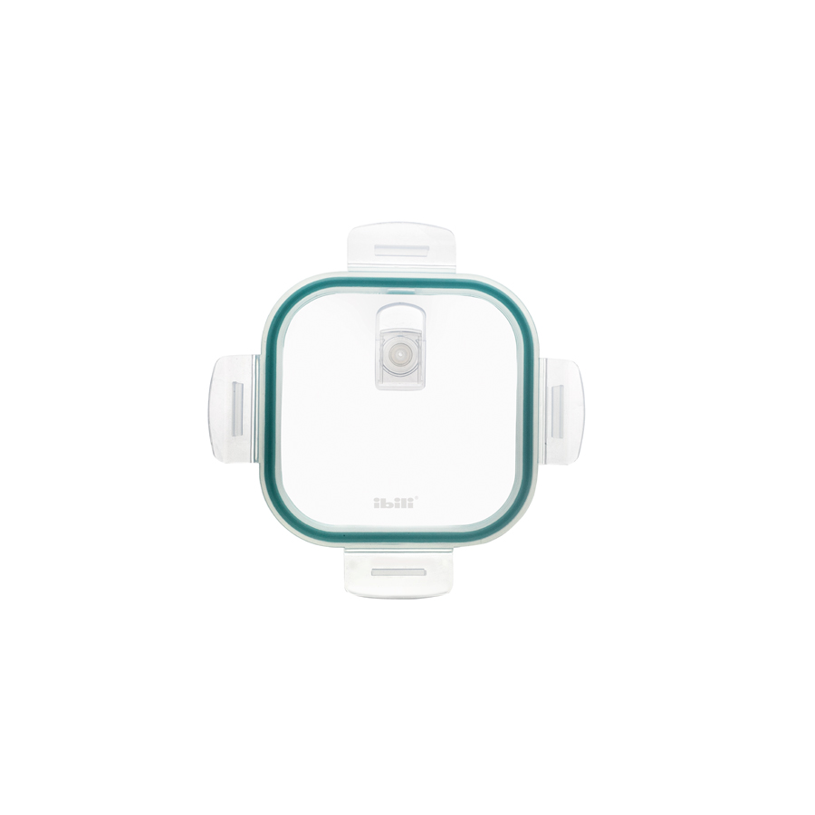 Square tempered glass container with hermetic lid and Air Vent valve that releases vacuum for easy opening.