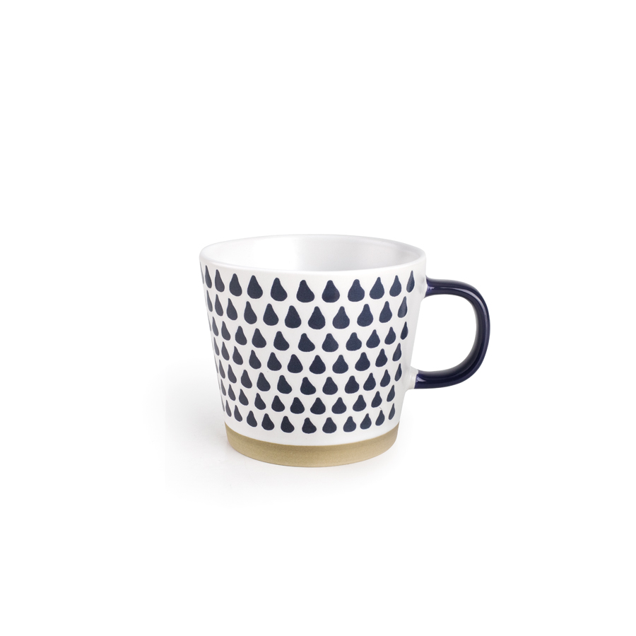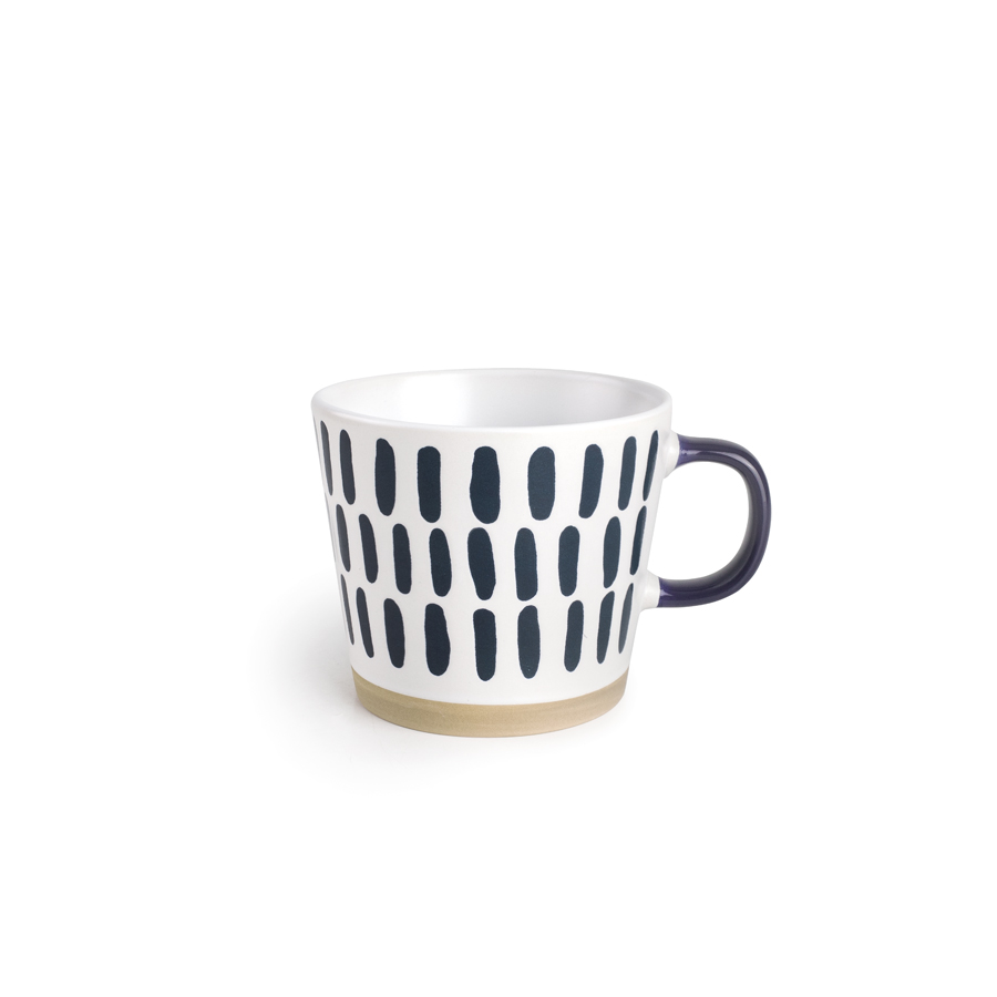 Glazed stoneware mug with contemporary design and assorted decorations.