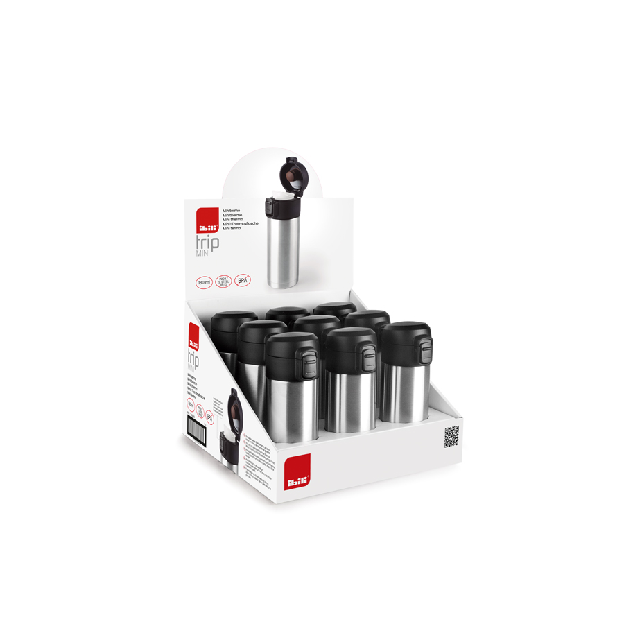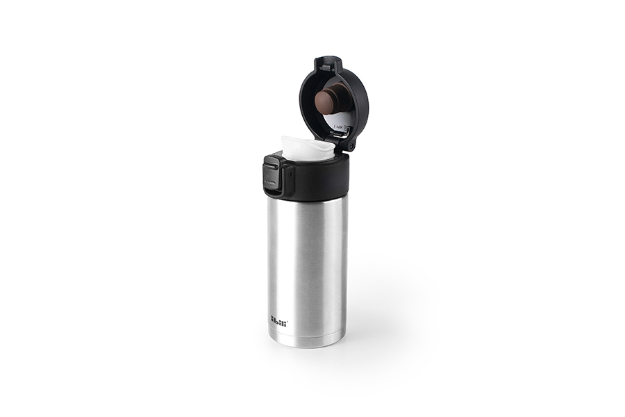 Termo mini en acero inoxidable con botón de apertura.