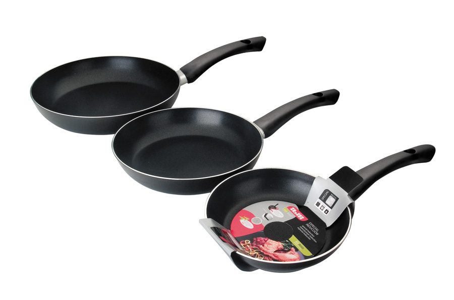Lote de 2 Sartenes Fusion fabricadas en aluminio para inducción con mango baquelita de tacto suave. Especiales para vitrocerámica e inducción y aptas para todas las cocinas. Disponen de fondo de acero inoxidable 18% que permite un calentamiento uniforme y rápido para un ahorro energético. Incorporan antiadherente 2 capas de alta calidad, libre de PFOA.
