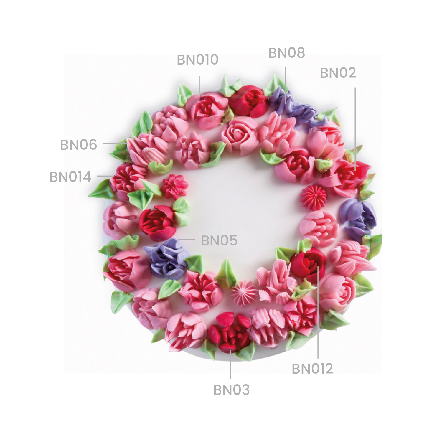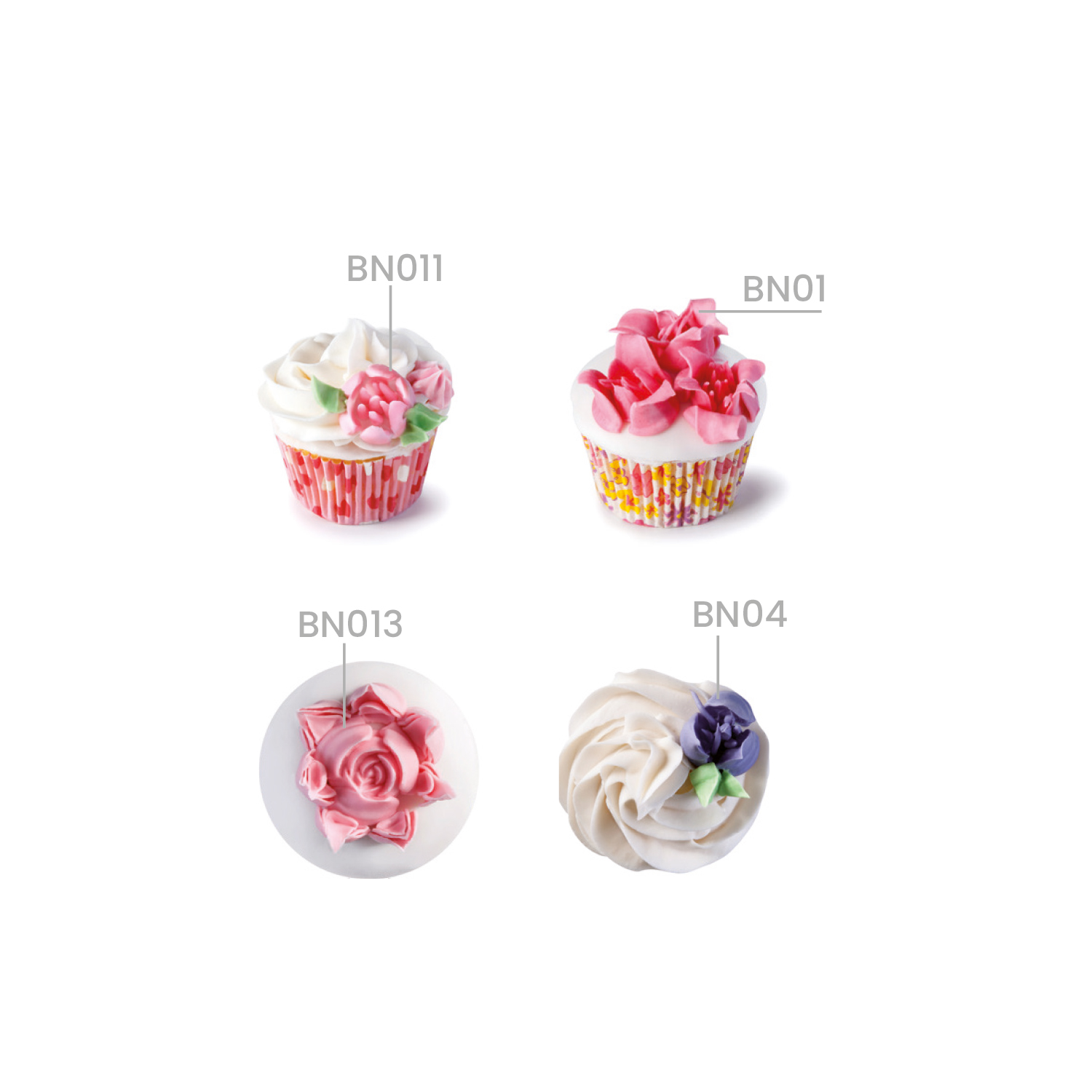 Set de 12 boquillas que permiten formar flores complejas de glasa o buttercream de forma muy fácil. Solo tienes que colocar la boquilla dentro de la manga pastelera o acoplarla a un adaptador de boquillas adecuado. están fabricadas en acero inoxidable de una sola pieza, sin uniones, locual permite formar flores perfectas.