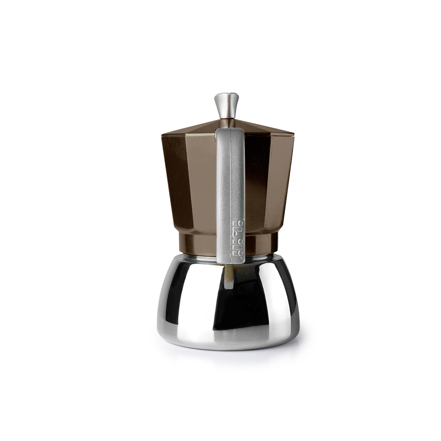 Cafetera en aluminio fundido con cuerpo inferior de acero inoxidable.