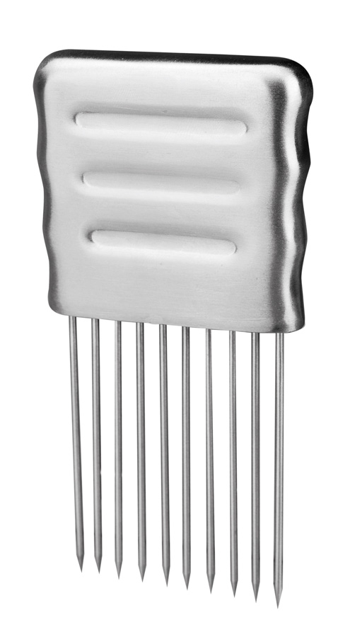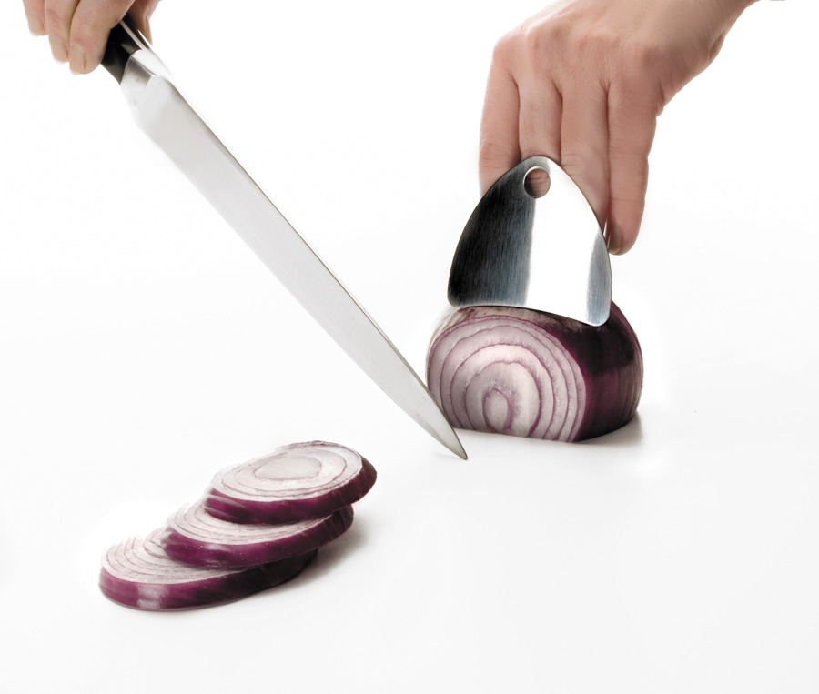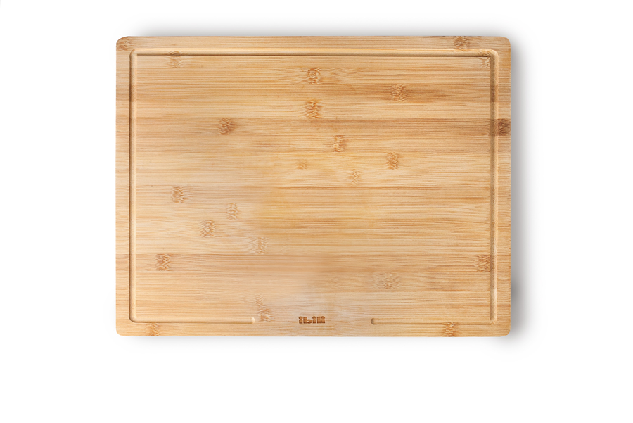 Fabricada en bambú, esta tabla está diseñada con un tope que permite apoyarla firmemente contra la encimera, asegurando estabilidad durante su uso.