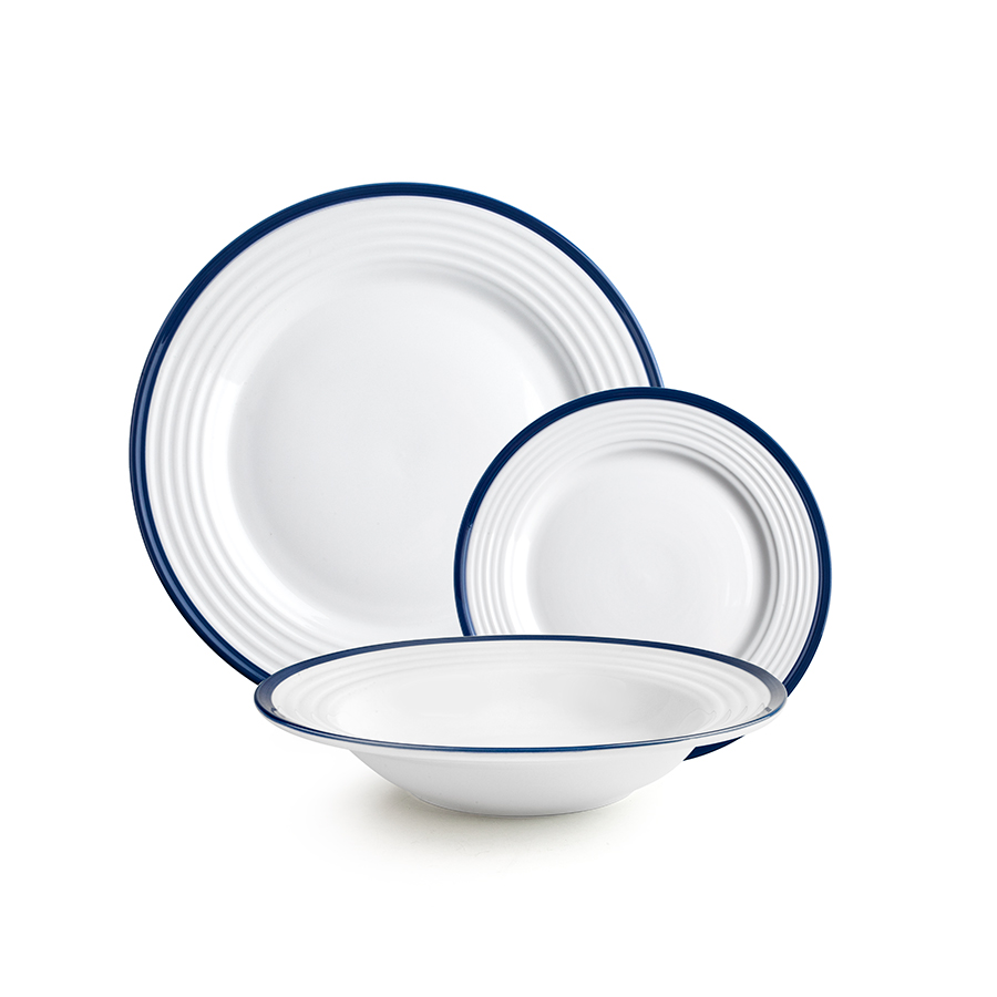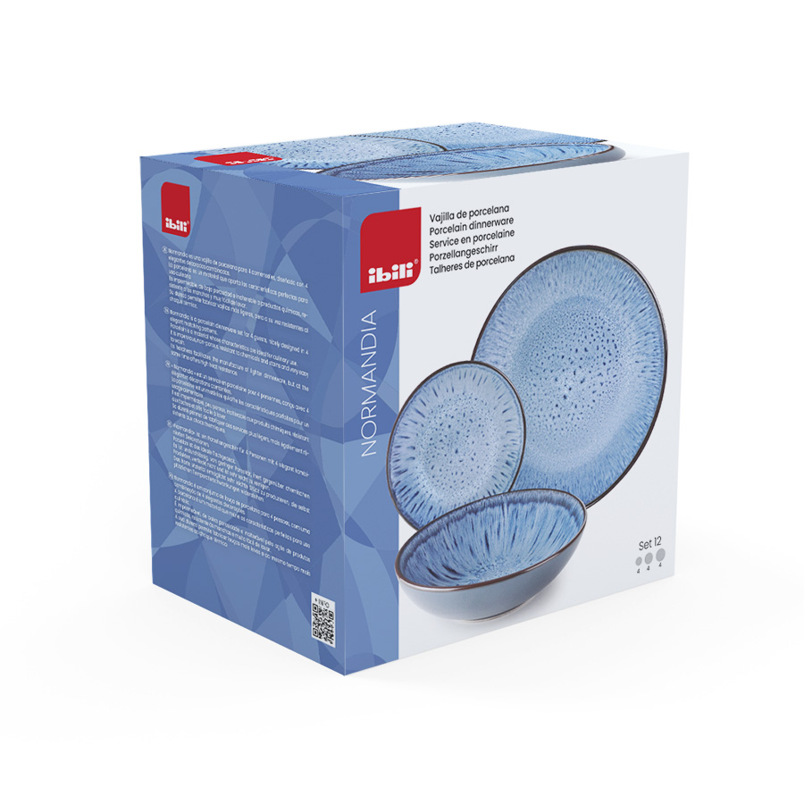 Vajilla de porcelana para 4 comensales, con un esmaltado reactivo que produce una superficie única en tonos azules naturales.