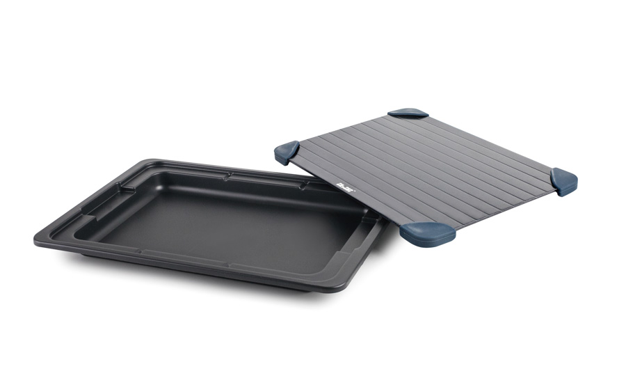 Placa para descongelar alimentos fabricada en aluminio recubierto y apoyos en silicona 100%. Reduce el tiempo de descongelado a más de la mitad en todo tipo de alimentos. Únicamente hay que sacar el alimento del congelador y ponerlo en la placa. Se trata de alimentos que puedan apoyarse en gran medida en la propia bandeja de descongelación, puesto que es el propio contacto con la bandeja lo que permite una descongelación más rápida. Es decir, todo tipo de filetes o tacos de carne , pescado o verdura , y otros alimentos ya cocinados y posteriormente congelados. La bandeja inferior permite recoger el liquido que pueda generarse en el proceso de congelación. No necesita electricidad, ni Baterías. Apto para lavavajillas.