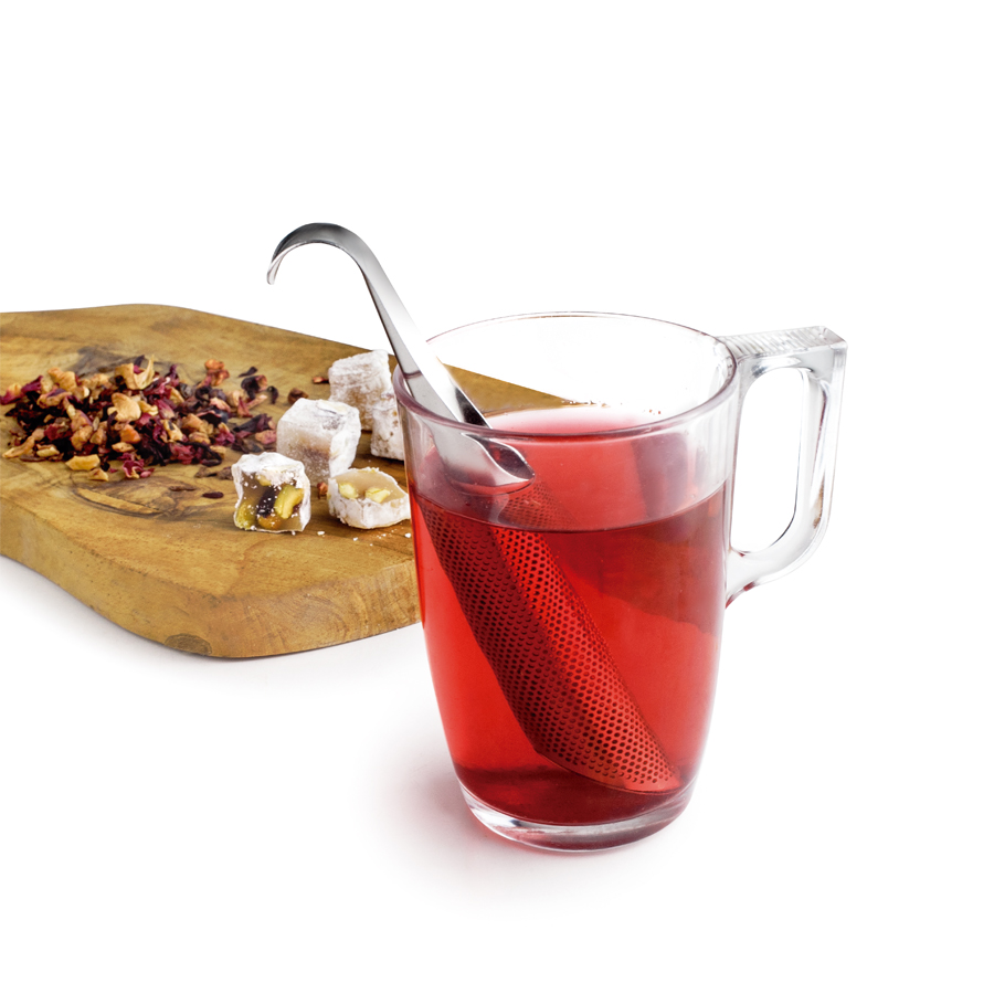Filtro reutilizable de acero inoxidable, ideal para infusiones de hojas sueltas.