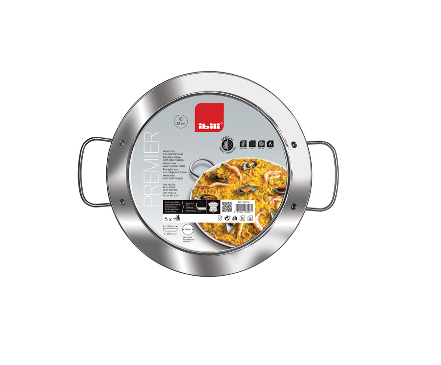 Le plat à paella Inox Premier est fabriqué en acier inoxydable, avec des anses de haute qualité 18/10. Spécial pour vitrocéramique et induction et convient à toutes les cuisinières. Valable également pour le four. Le fond diffuseur Full Induction permet un chauffage uniforme et rapide pour des économies d'énergie, grâce au disque complet en acier 18 %. La gamme de tailles permet de servir de 2 à 9 convives, qui peuvent se régaler avec la délicieuse recette de paella aux fruits de mer incluse dans l'emballage.