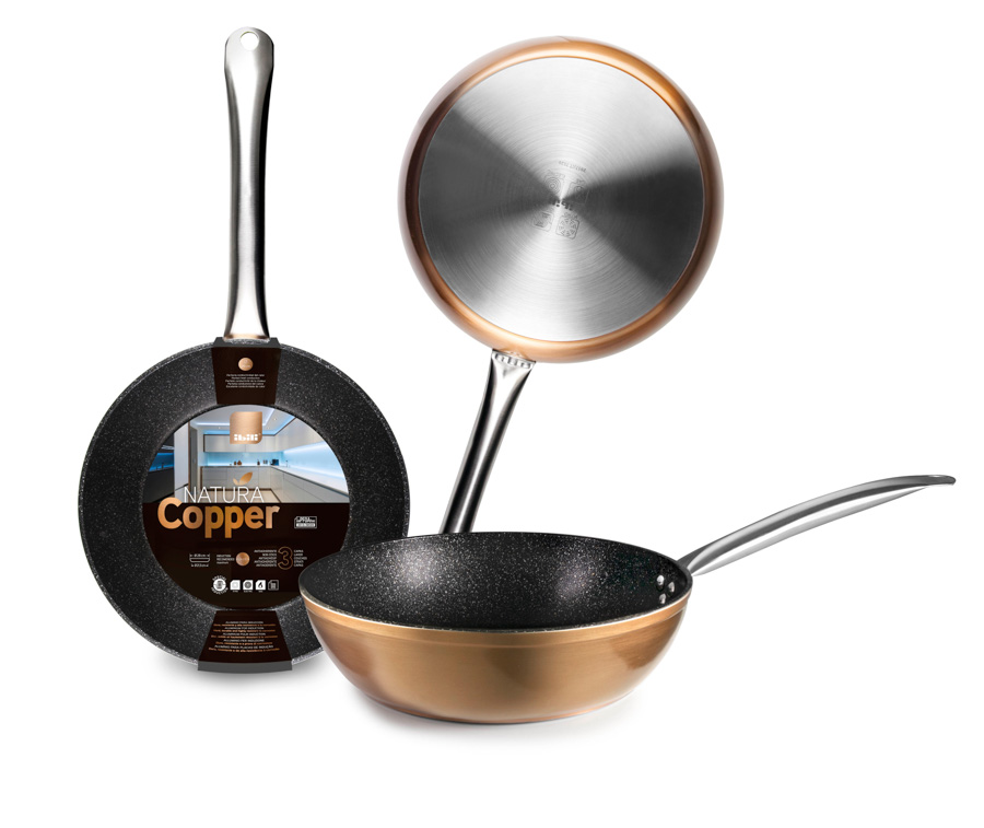 La casserole Natura Copper est fabriquée en aluminium forgé pour induction haute qualité avec finition style cuivre résistant à la corrosion (4 mm d’épaisseur). Sa ligne élégante comprend un manche en acier inoxydable riveté qui évite la surchauffe. Spéciale pour vitrocéramique et induction et adaptée à tout type de cuisinières, four inclus jusqu’à 200°. Le fond diffuseur Full Induction permet un chauffage uniforme et rapide pour des économies d'énergie, grâce au disque complet en acier 18 %. Revêtement antiadhésif 3 couches style pierre. La ligne Natura Copper est composée de matériaux durs et très résistants à la corrosion.