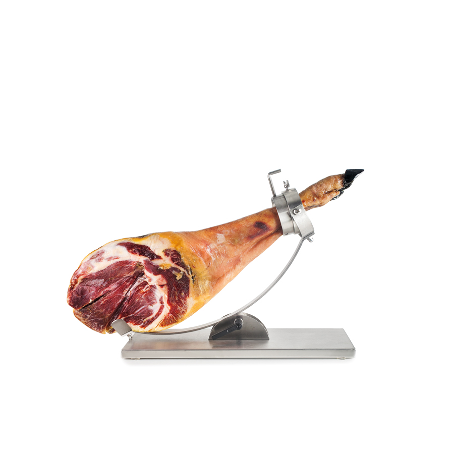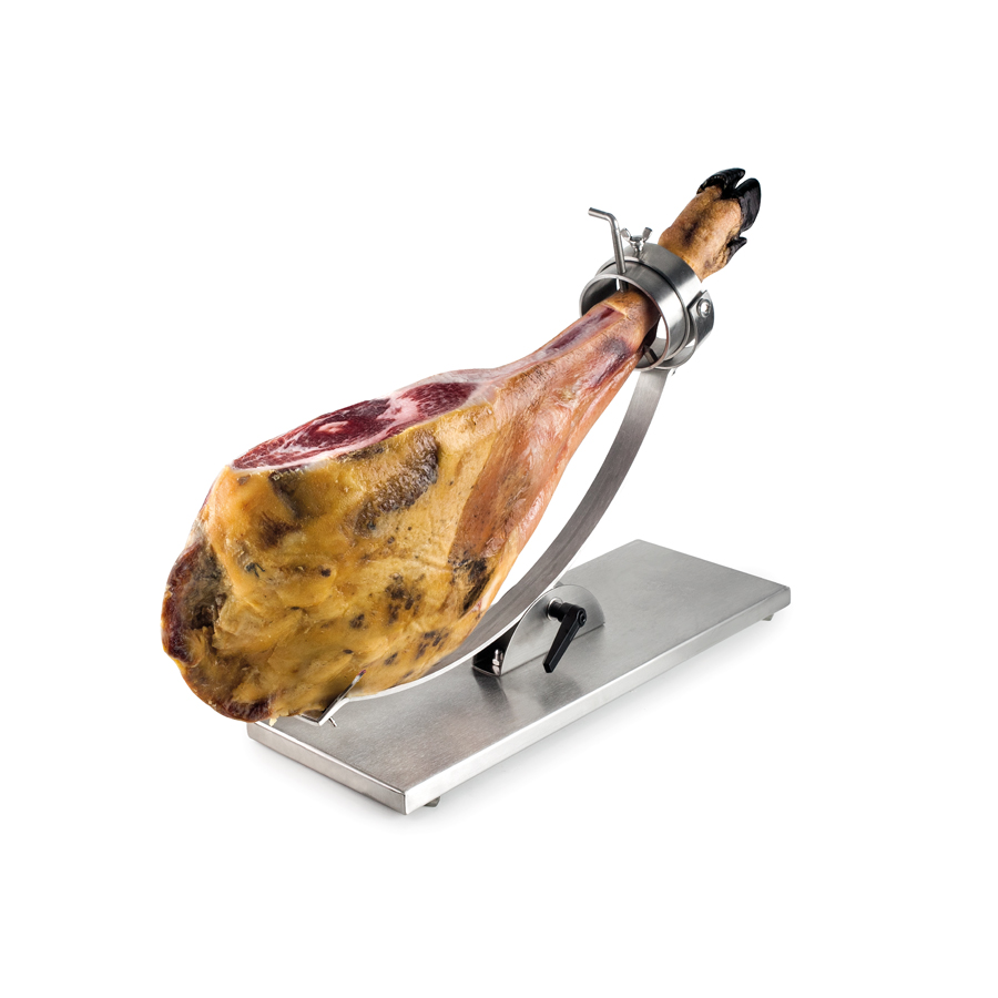Porte-jambon professionnel avec système rotatif et basculant pour une découpe confortable et précise.