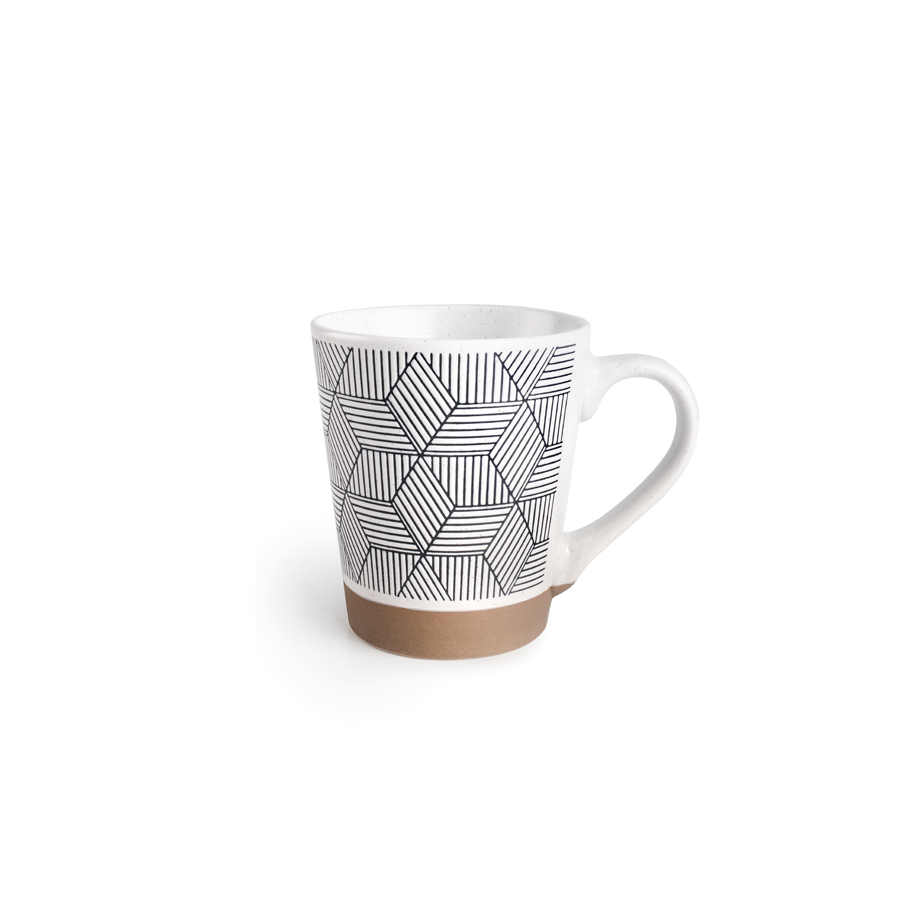 Mug en grès émaillé au design moderne avec décorations assorties.