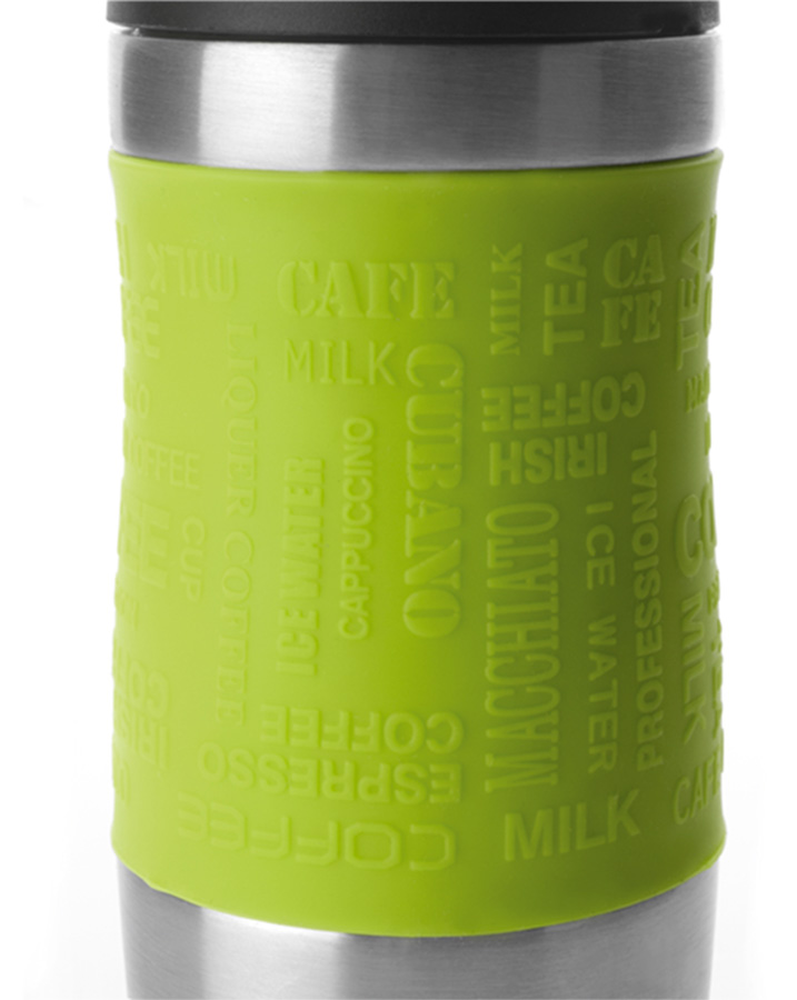 Its leak-proof screw-tight closure technology and its double wall with intermediate vacuum allow the temperature of both hot and cold liquids to be maintained for a long period of time (approximately 12 hours). Easy-to-clean removable lid, silicone coating for a comfortable grip and non-slip rubber base. This reusable cup is perfect for replacing disposable plastic bottles, also contributing to improving the environment.