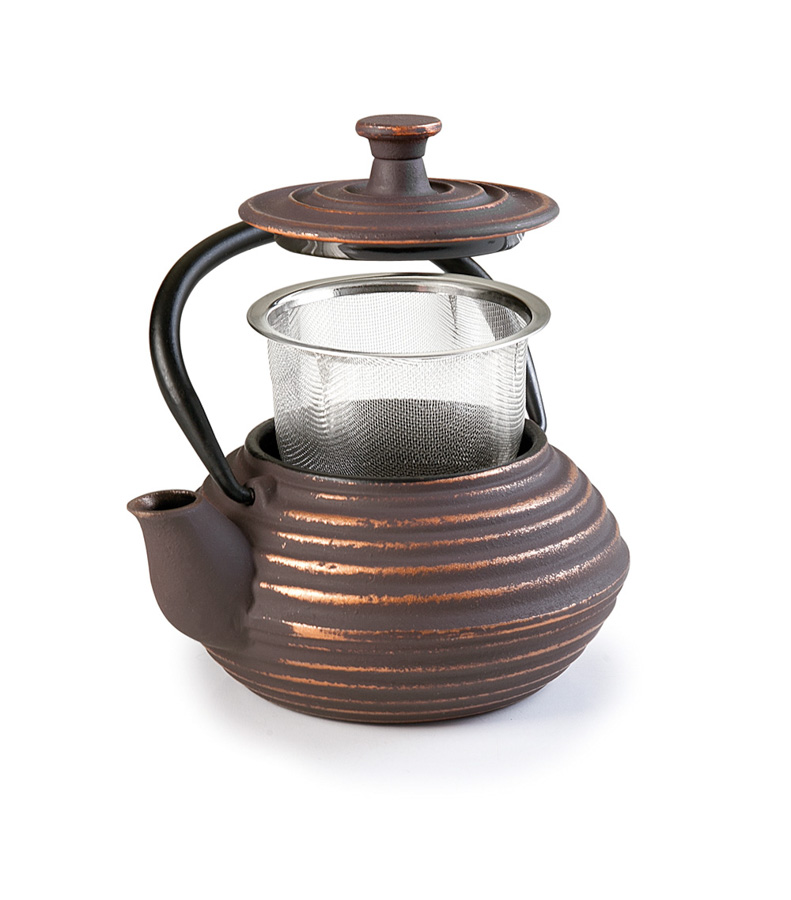 Cast iron teapot. Elegant design teapot that keeps the tea hot for a long time, which allows you to keep the teapot on the table without having to move to reheat it. 18/10 stainless steel filter + enamelled interior.