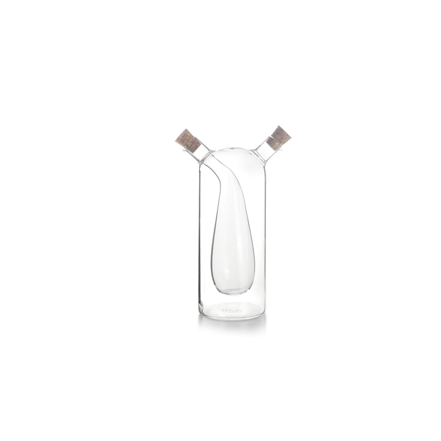 Unique design with a double bottom and a smaller inner cylindrical container that allows oil and vinegar to be stored separately in a single utensil.