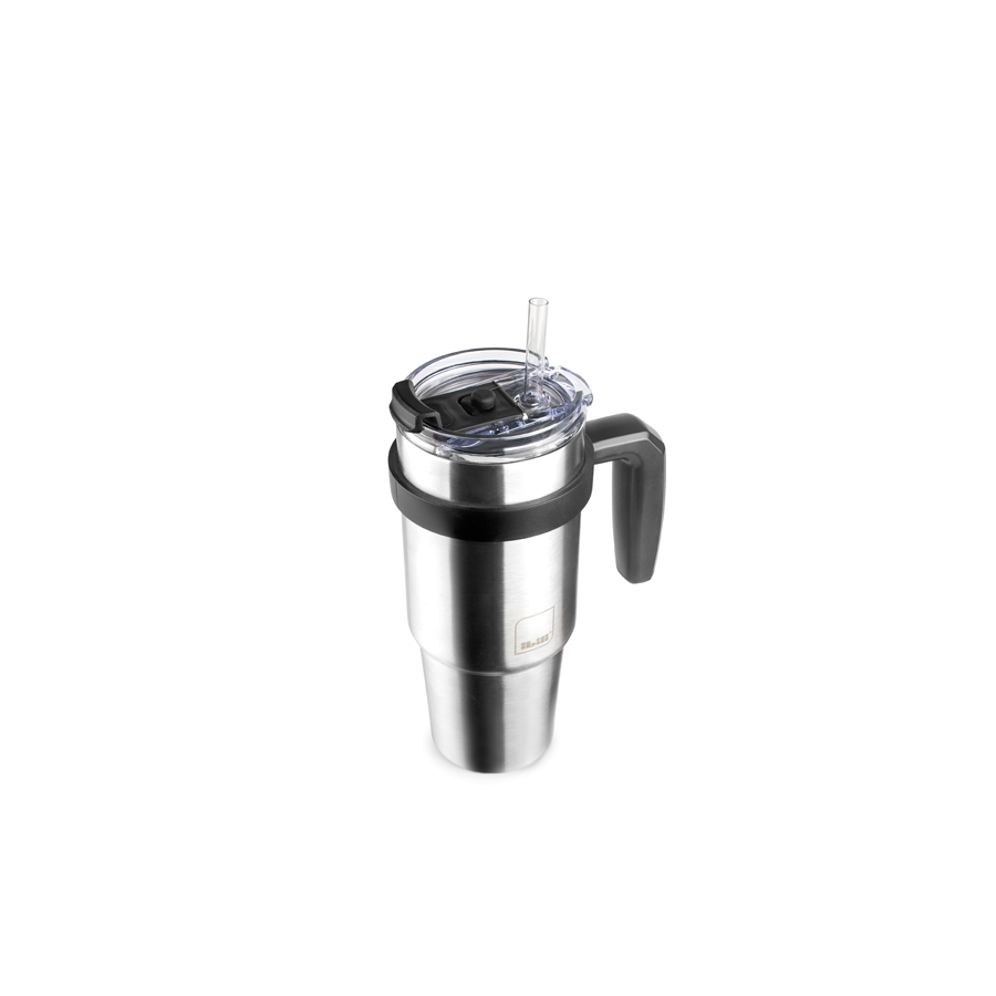 Double-wall insulated mug with ergonomic handle and reusable straw.