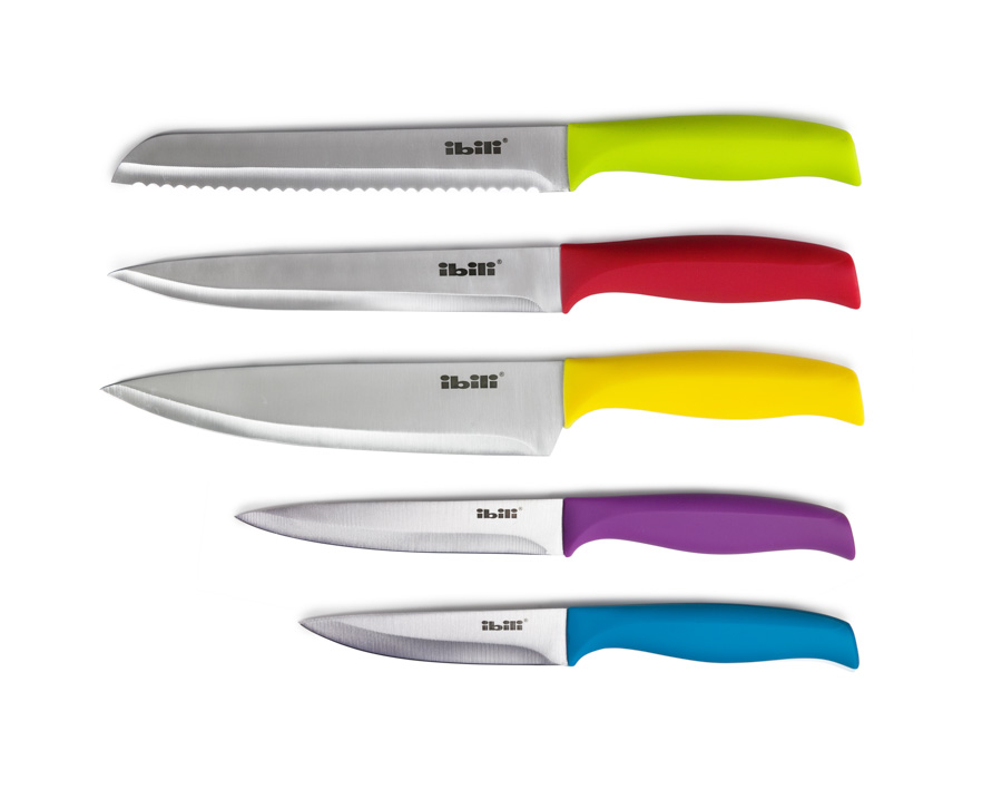 Juegos de 5 cuchillos colorful.Juego de cuchillos compuesto por taco fabricado en madera y 5 cuchillos para diferentes usos en la cocina.Los cuchillos son de acero inoxidable y tienen el mango de plástico Con este juego tus cuchillos de cocina estarán siempre accesibles y los podrás guardar de manera segura, ordenada, limpia. Guardar los cuchillos en un taco, evita accidentes. La hoja el cuchillo queda perfectamente protegida.
