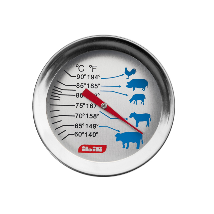 Termómetro para carne con sonda Inox, se puede utilizar en el horno por debajo de 150° y el metal podría cambiar de color. Cuando la aguja se sitúa sobre el tipo de carne que estamos cocinando, el alimento estará ya cocinado.