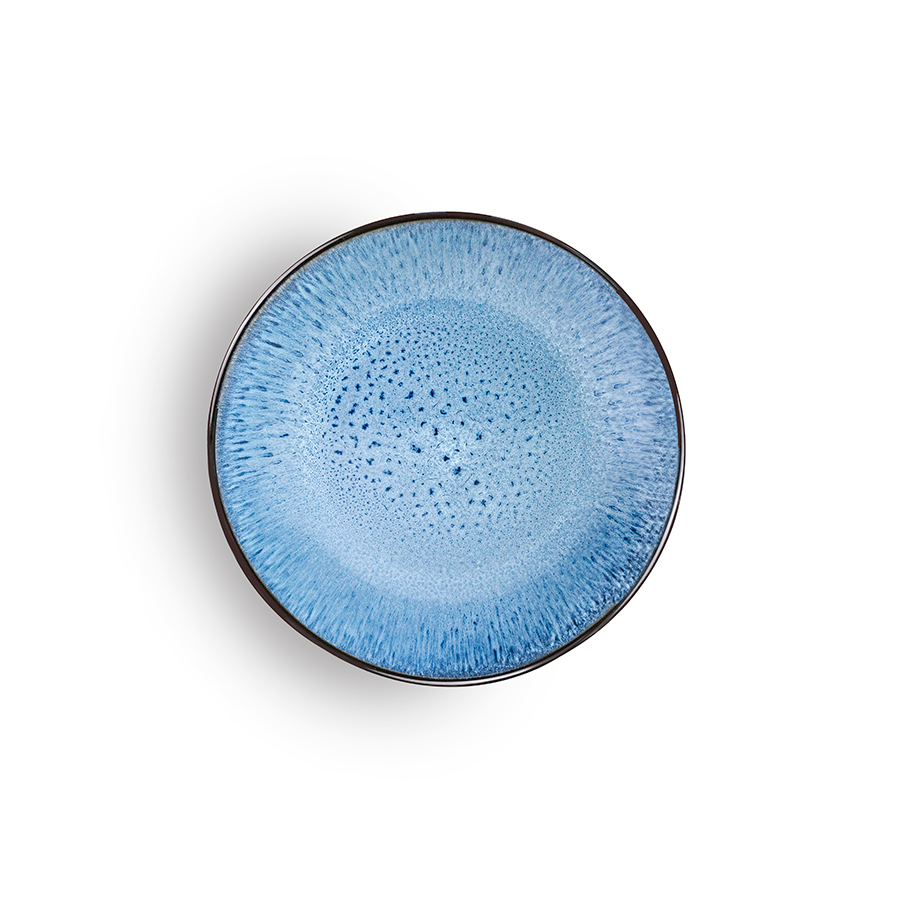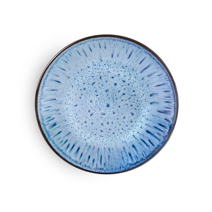 Vajilla de porcelana para 4 comensales, con un esmaltado reactivo que produce una superficie única en tonos azules naturales.