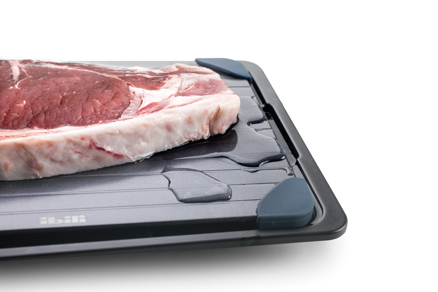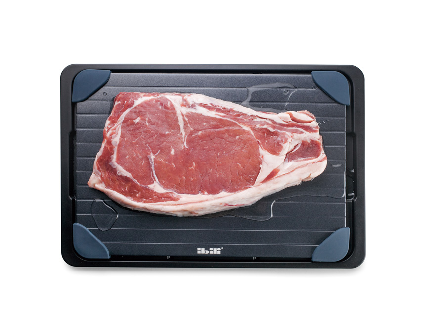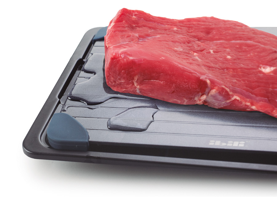 Placa para descongelar alimentos fabricada en aluminio recubierto y apoyos en silicona 100%. Reduce el tiempo de descongelado a más de la mitad en todo tipo de alimentos. Únicamente hay que sacar el alimento del congelador y ponerlo en la placa. Se trata de alimentos que puedan apoyarse en gran medida en la propia bandeja de descongelación, puesto que es el propio contacto con la bandeja lo que permite una descongelación más rápida. Es decir, todo tipo de filetes o tacos de carne , pescado o verdura , y otros alimentos ya cocinados y posteriormente congelados. La bandeja inferior permite recoger el liquido que pueda generarse en el proceso de congelación. No necesita electricidad, ni Baterías. Apto para lavavajillas.