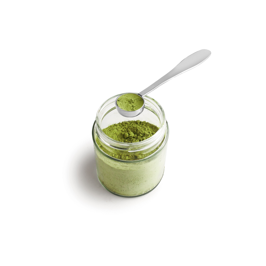 Cuchara de acero inoxidable, ideal para medir la cantidad exacta de té matcha por porción.
