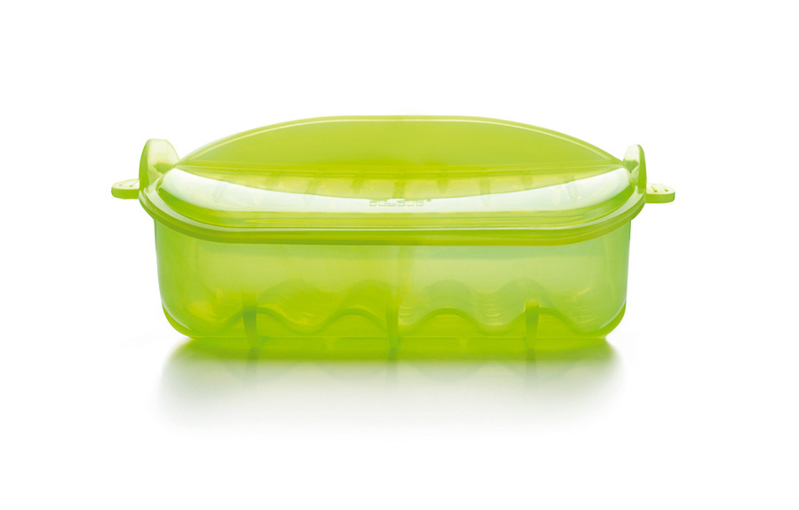 Al sacarlo del microondas, el vapor que se genera en el interior puede escaparse por los huecos que se forman entre la tapa y el recipiente, y nos podemos quemar. Por eso, las asas del recipiente de vapor Ibili, están diseñadas con esta forma, que sirve de escudo contra el vapor y ayuda a sujetar la tapa para que se mantenga bien cerrada por la zona en la que están los dedos. ¿Buena idea verdad?