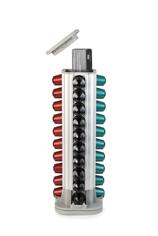 Dispensador de diseño moderno para mantener ordenadas y a mano todas tus capsulas de café. Incluye contenedor para caja de capsulas
