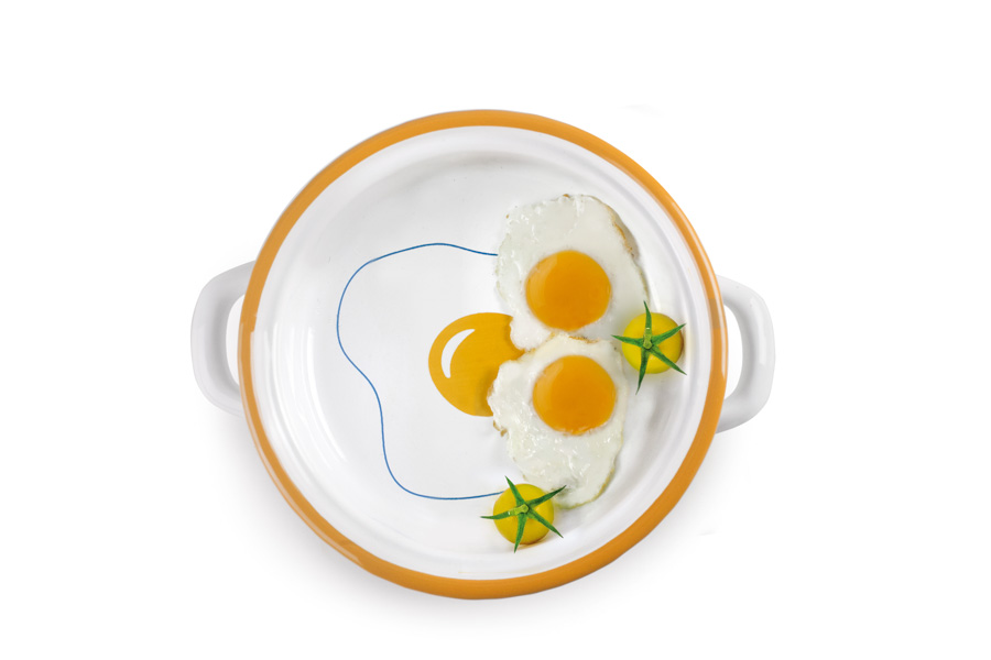 Vaisselle GASTRODESSIN à acier vitrifié émaillé, avec des motifs différents sur chaque pièce, conçue exclusivement pour servir différents aliments.